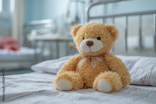 Hospital Room Interior with a Comforting Teddy Bear on Bed