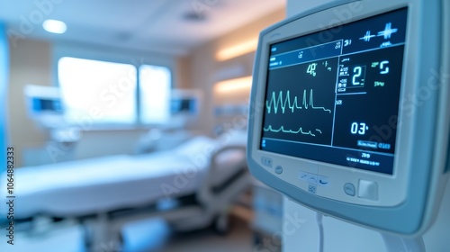 Hospital Room with Heart Rate Monitor and Blurred Patient Bed
