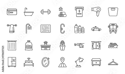 Hospitality and travel line icon set. Vector pictograms of key card, bathtub, shower, hairdryer, ATM, taxi, cruise ship, and bed, thin linear illustration.