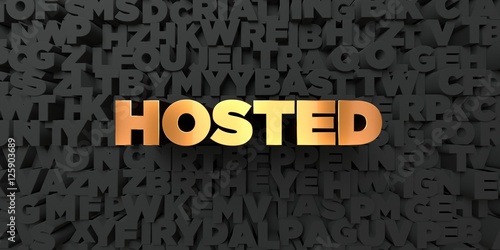 Hosted - Gold text on black background - 3D rendered royalty free stock picture. This image can be used for an online website banner ad or a print postcard.