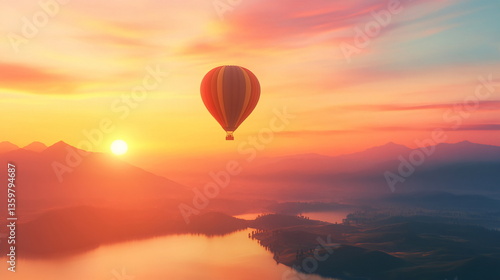 Hot Air Balloon at Sunrise with Mountain and Lake Landscape Scenery