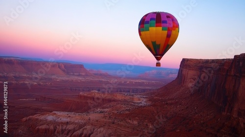 Hot air balloon floating over rugged terrain and vast open spaces at dawn
