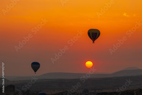 Hot air balloon flying over rocky landscape at sunrise in Cappadocia. Turkey