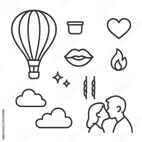 Hot Air Balloon Romance. Outline style icons of Hot Air Balloon First Kiss: balloon envelope, basket silhouette, kissing lips,