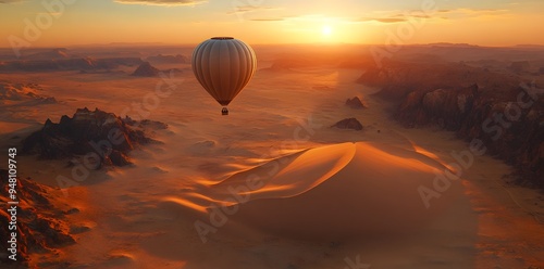Hot Air Balloon Soaring Over Desert Dunes at Sunset