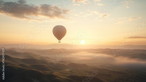 Hot Air Balloon Soaring Over Misty Mountain Landscape at Sunrise