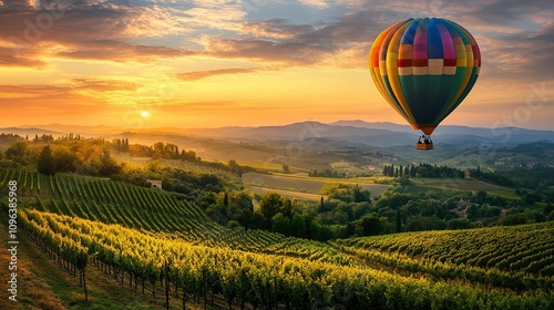 Hot air balloon soaring over picturesque vineyards at sunrise.