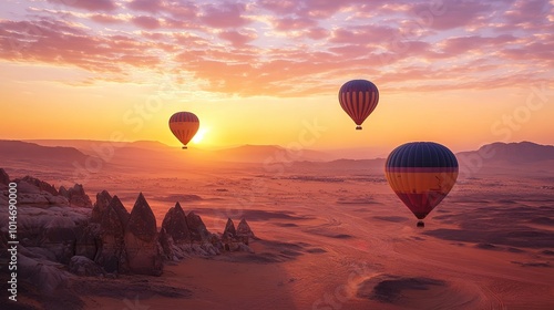 Hot air balloons floating over a desert landscape at sunrise with colorful skies and rocky formations in the background