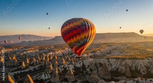 Hot air balloons flying over Cappadocia Turkey at sunrise aerial view