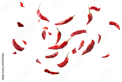 Hot chilies floating in the air with falling pieces creating an enticing culinary display in a blurred background