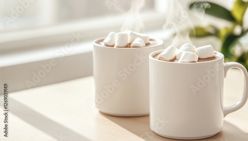 Hot Chocolate topped with marshmallows by the window; warm drink for the season