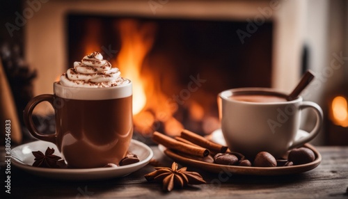 Hot chocolate with whipped cream and spices on a wooden table in front of a fireplace