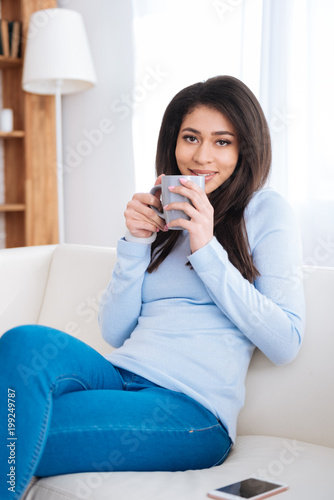Hot coffee. Adorable nice woman enjoying coffee while looking at camera
