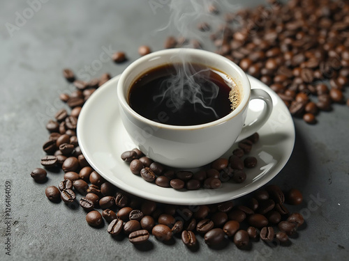 Hot Coffee Cup with Steaming Coffee and Coffee Beans