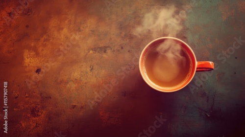 Hot Coffee in Orange Mug Against Rustic Background with Steam