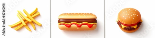 hot dog, burger and fries with a ketchup bottle on a white background. A fast food menu elements collection.