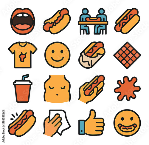 Hot dog icon collection. fast food silhouette icons: bite, drink, smile, thumbs up