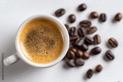 “Hot espresso coffee in white cup with roasted beans on table / cup of coffee with beans