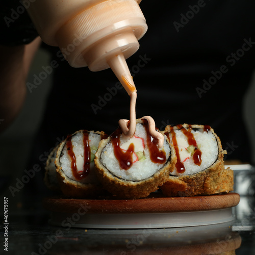 Hot fried Sushi Roll with salmon, avocado and cheese.