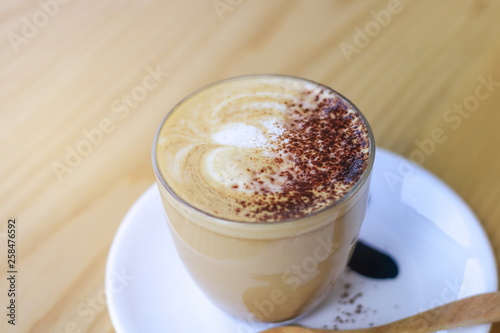 Hot latte juice in a glass with a white coaster with a wooden spoon placed on a beautiful wood table.