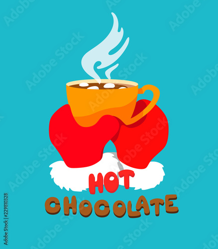 Hot mug with chocolate and marshmallows are held in winter mittens. An illustration with the inscription Hot Chocolate