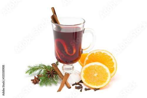 Hot mulled wine for winter with spices isolated on white background. Closeup.