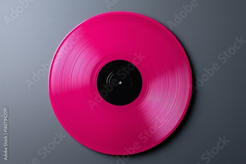 Hot pink vinyl record with black center, Flat on dark gray textured background