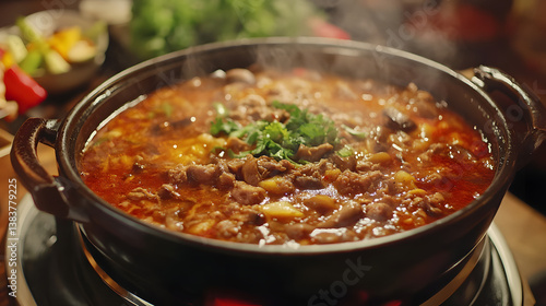 Hot pot filled with savory broth, meat, and vegetables. A comforting, flavorful meal steaming on the table, with garnish adding a touch of freshness.