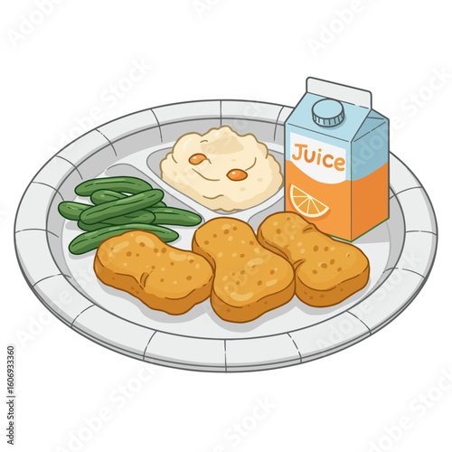 Hot school lunch tray with chicken nuggets, mashed potatoes, green beans, and juice