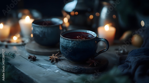 Hot spiced wine punch served in mugs with star anise.