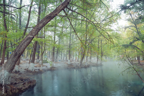 Hot Spring, Blurred photo of morning fog over a lake in cold autumn weather in half moon san luis potosi