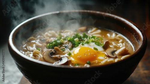 Hot Steaming Ramen Bowl with Mushrooms and Egg
