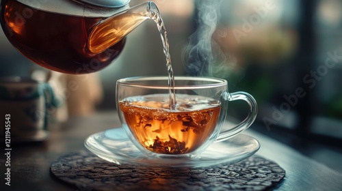 Hot tea being elegantly poured into a clear glass cup showcasing its rich color and steam for a cozy, inviting atmosphere