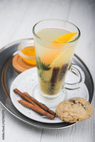 hot tea in glass on wood table
