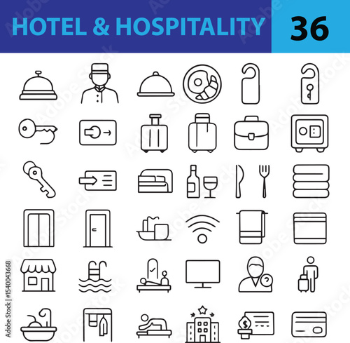 Hotel and Hospitality Line Icons Set Editable Vector Symbols for Travel, Service, Accommodation, and Guest Experience