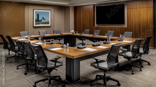 Hotel conference room with modern presentation equipment, a long meeting table, and ergonomic chairs