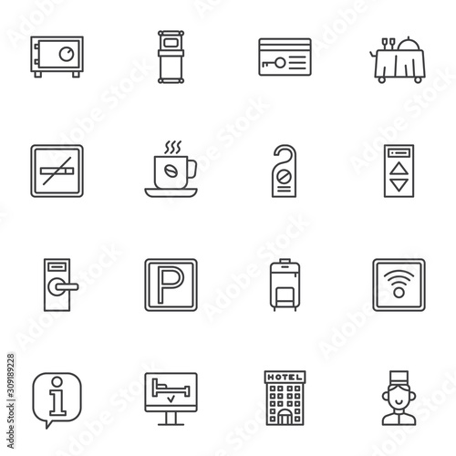 Hotel service line icons set. linear style symbols collection, outline signs pack. vector graphics. Set includes icons as car parking, wireless key, safe box, information support, hotel building, lift