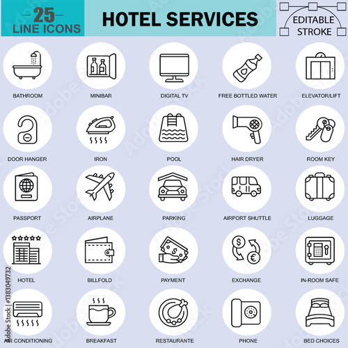 Hotel Services Icon Set – 25 Editable Line Vector Icons for Hospitality, Travel, Booking and More for Apps & UI Design