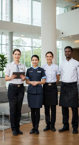 Hotel Staff Portrait: Teamwork, Hospitality, and Professionalism in Modern Lobby Setting. Service Excellence, Diverse Team, Guest-Focused!