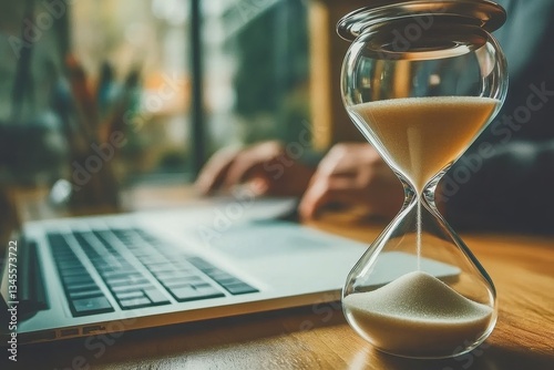 Hourglass and laptop on desk with person. It shows deadlines, time management, and urgency.