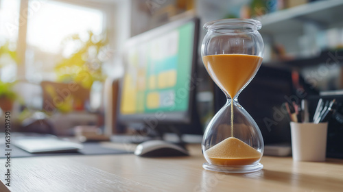 Hourglass and mobile phone on desk versus businesswoman working with computer in office, close up