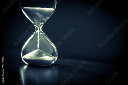 Hourglass as time passing concept for business deadline, urgency and running out of time. Sandglass, egg timer on dark background showing the last second or last minute or time out. With copy space.