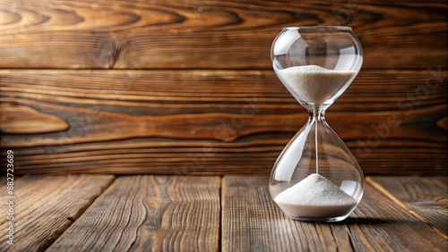 Hourglass filled with white sand on wooden table , time, clock, deadline, hour, glass, sand, running out, passing, concept