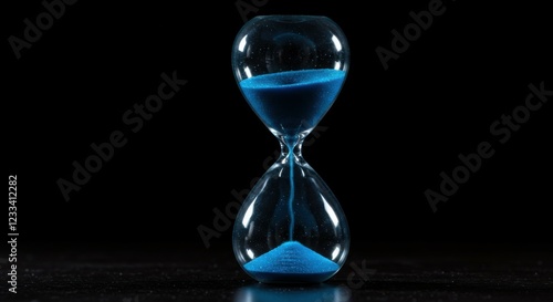 hourglass, glowing blue sand, transparent glass, black background, high contrast, time concept, dramatic lighting, reflective surface, minimalist design, crisp details, studio photography, conceptual