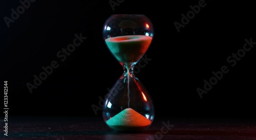 hourglass, glowing neon sand, futuristic, cyberpunk, dark background, reflective surface, blue and red light, time concept, digital art, 3D rendering, high contrast, sleek design, sci-fi aesthetic, hy