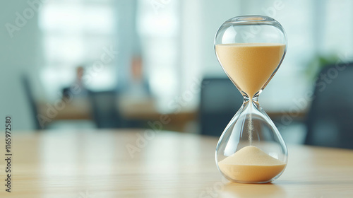 Hourglass is showing passing time on desk in office environment with blurred businesspeople working in background