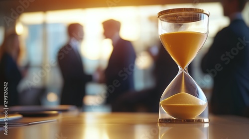 Hourglass of Corporate Deadlines – A sleek hourglass with golden sand on a conference table, symbolizing time pressure and decision-making in a professional business setting.