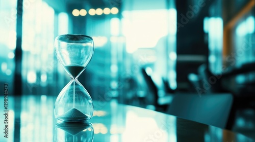 Hourglass on a reflective table with blurred office background featuring modern architecture and ambient lighting Copy Space