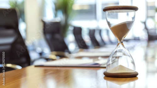 Hourglass on a wooden conference table with blurred chairs in the background. Concept of time management and meeting focus.