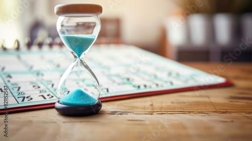 Hourglass on calendar marking the swift passage of time towards a crucial deadline